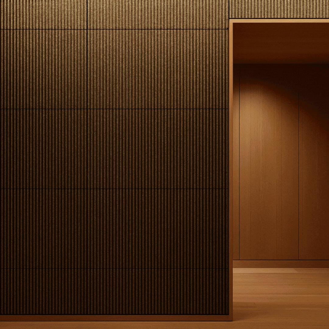 Acoustic panels with MDF slats and a felt back are designed to enhance the sound quality of a room by absorbing sound waves. The MDF slats and felt backing work together to reduce echoes, control reverberation, and improve overall acoustics of your interior space.